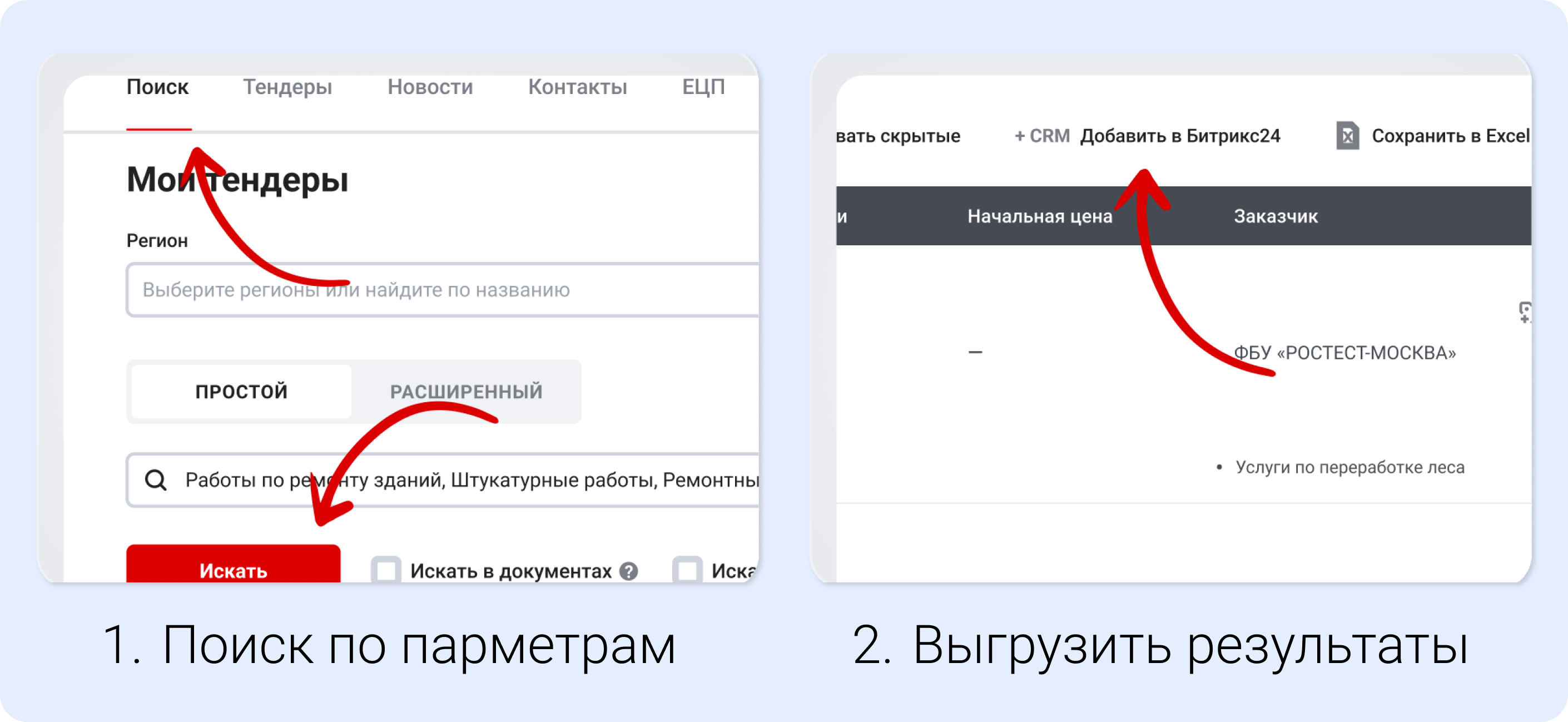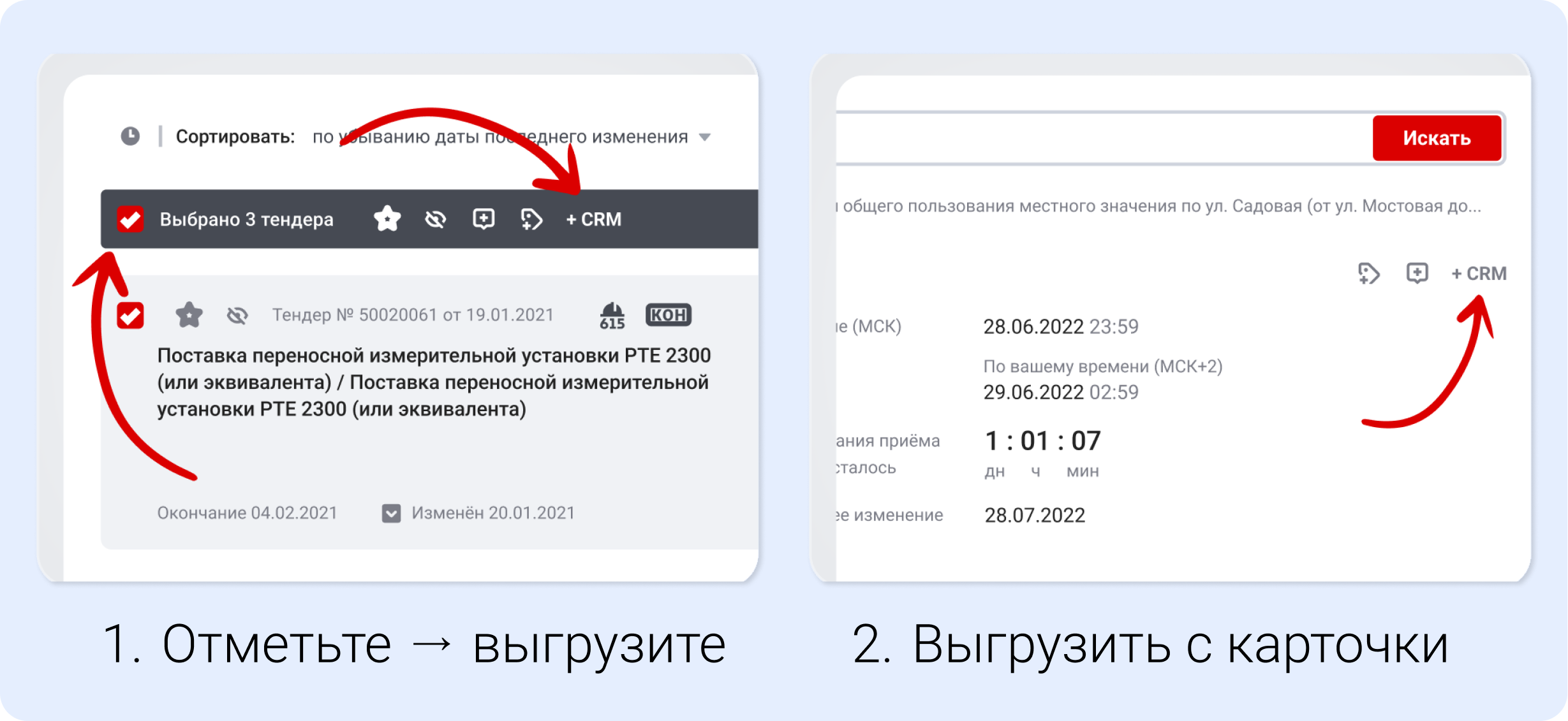 - Выберите один или несколько тендеров чек-боксом в таблице и нажмите кнопку выгрузки в CRM